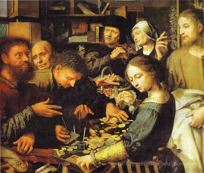 Wir bieten Ihnen eine handgefertigte Reproduktion auf Leinwand des berühmten Kunstwerks 'Jesus Beschwört Matthew an das Finanzamt verlassen' von Jan van Hemessen, aus dem Reproduktionsmuseum.