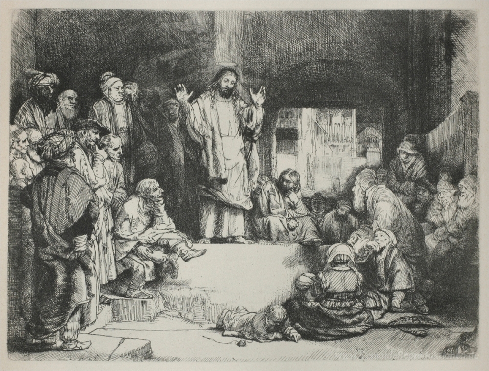 Wir bieten Ihnen eine handgefertigte Reproduktion auf Leinwand des berühmten Kunstwerks 'Jesus Predigt genannt La Tombe' von Rembrandt, aus dem Reproduktionsmuseum.