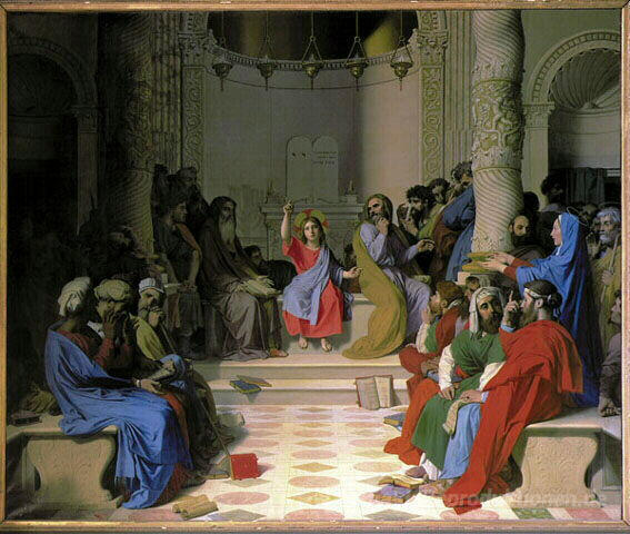 Wir bieten Ihnen eine handgefertigte Reproduktion auf Leinwand des berühmten Kunstwerks 'Jesus unter den Doktoren' von Jean Auguste Dominique Ingres, aus dem Reproduktionsmuseum.