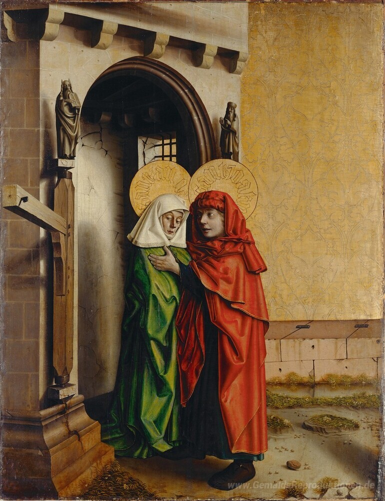 Wir bieten Ihnen eine handgefertigte Reproduktion auf Leinwand des berühmten Kunstwerks 'Joachim und Anna vor der Golden Gate' von Konrad Witz, aus dem Reproduktionsmuseum.