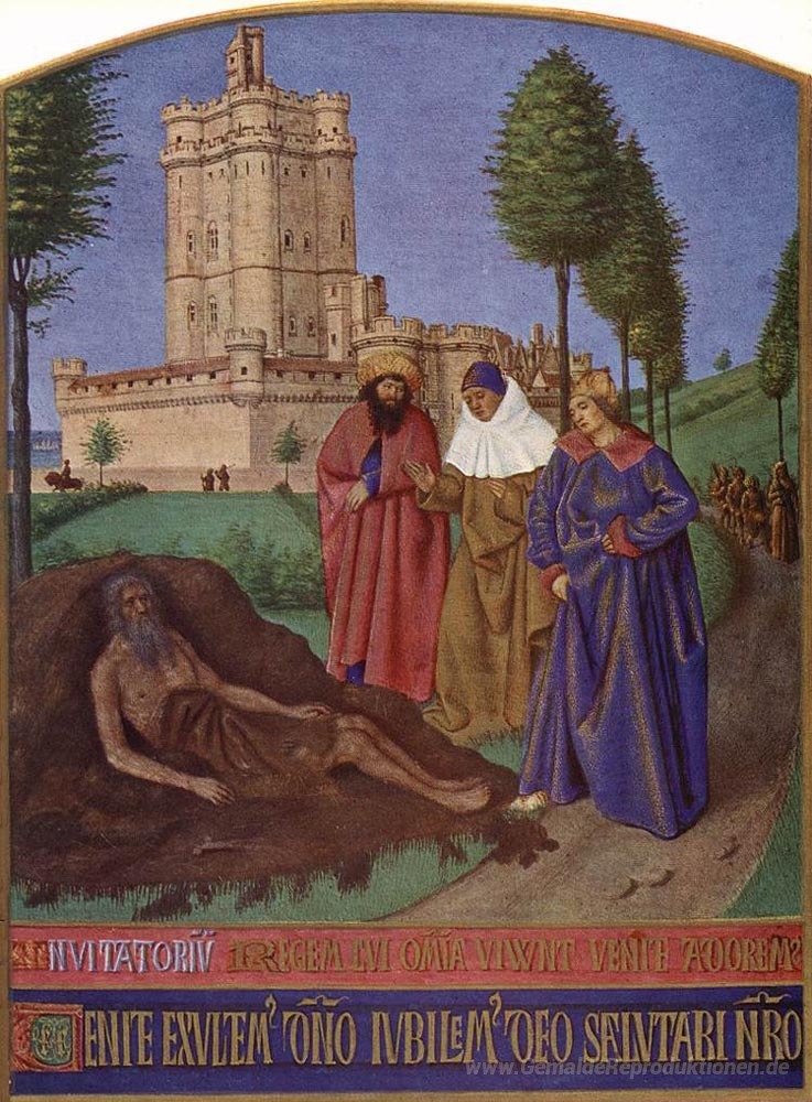 Wir bieten Ihnen eine handgefertigte Reproduktion auf Leinwand des berühmten Kunstwerks 'Job und seine falschen Tröster' von Jean Fouquet, aus dem Reproduktionsmuseum.