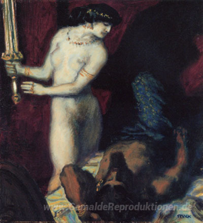 Wir bieten Ihnen eine handgefertigte Reproduktion auf Leinwand des berühmten Kunstwerks 'Judith und Holofernes' von Franz Stuck, aus dem Reproduktionsmuseum.
