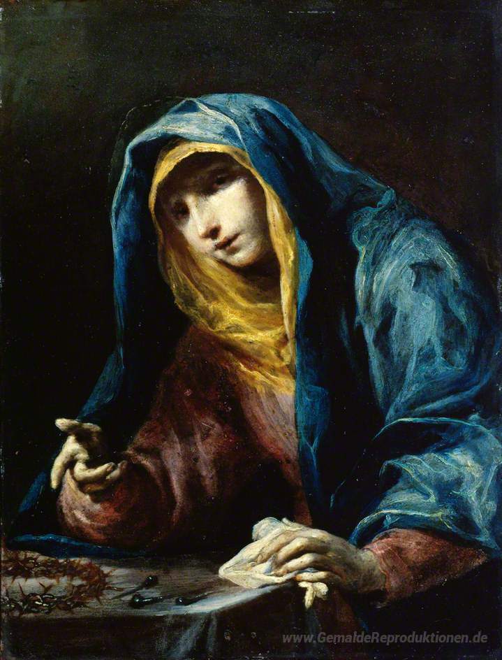 Wir bieten Ihnen eine handgefertigte Reproduktion auf Leinwand des berühmten Kunstwerks 'Jungfrau mit den Instrumenten der Passion' von Giuseppe Maria Crespi, aus dem Reproduktionsmuseum.