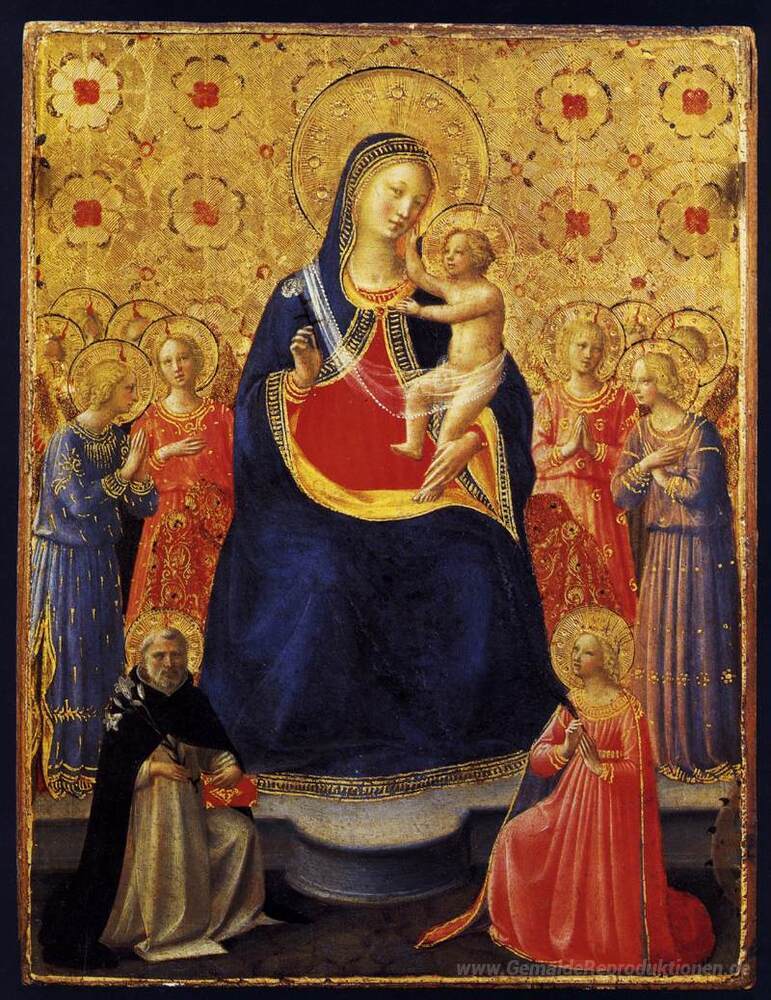 Wir bieten Ihnen eine handgefertigte Reproduktion auf Leinwand des berühmten Kunstwerks 'Jungfrau und Kind mit Überziehschutzanlage. Dominikus und Kathar' von Fra Angelico, aus dem Reproduktionsmuseum.