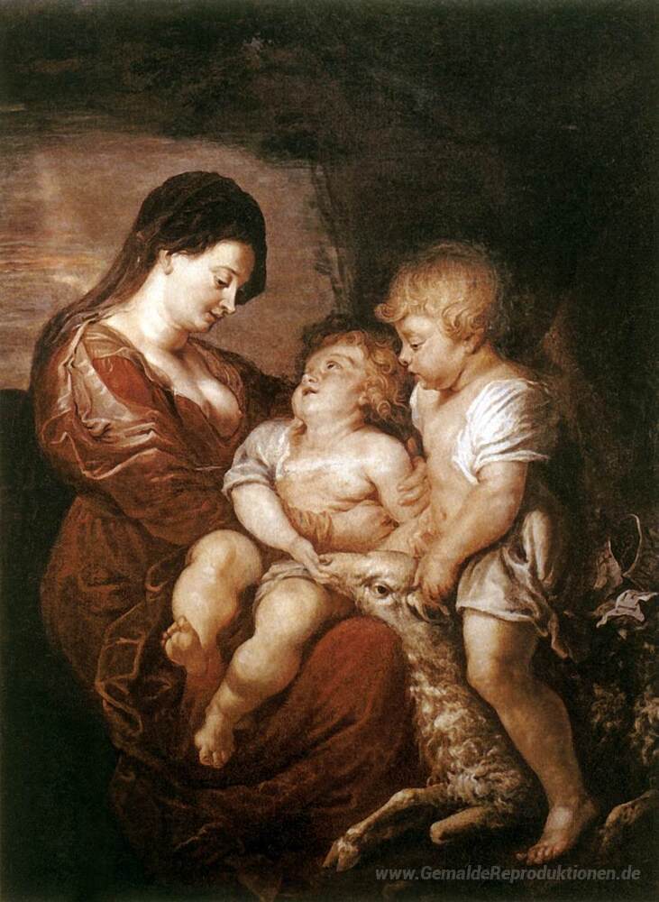 Wir bieten Ihnen eine handgefertigte Reproduktion auf Leinwand des berühmten Kunstwerks 'Jungfrau und Kind mit der Infant St. John' von Peter Paul Rubens, aus dem Reproduktionsmuseum.
