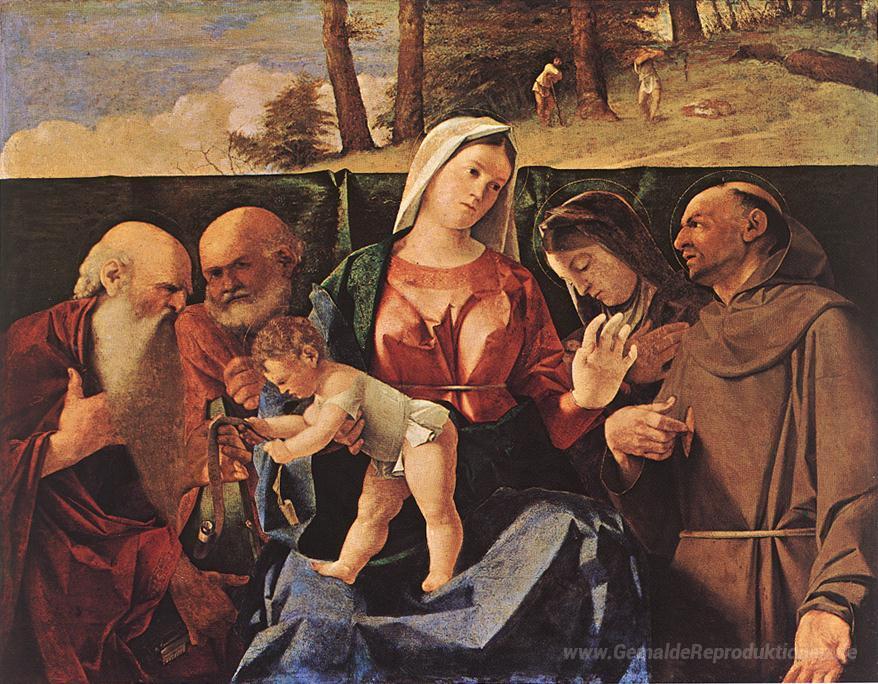 Wir bieten Ihnen eine handgefertigte Reproduktion auf Leinwand des berühmten Kunstwerks 'Jungfrau und Kind mit Heiligen Hieronymus, Peter, Klara und Fran' von Lorenzo Lotto, aus dem Reproduktionsmuseum.