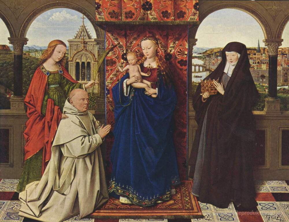Wir bieten Ihnen eine handgefertigte Reproduktion auf Leinwand des berühmten Kunstwerks 'Jungfrau und Kind mit Heiligen und Spender' von Jan van Eyck, aus dem Reproduktionsmuseum.