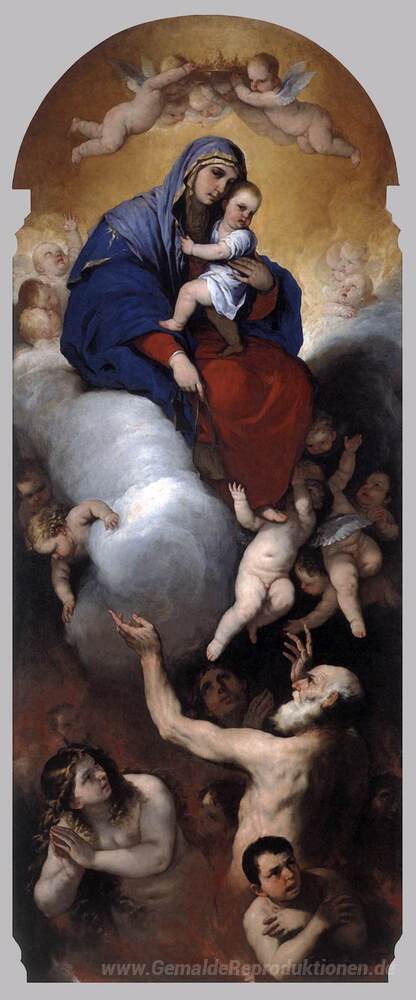 Wir bieten Ihnen eine handgefertigte Reproduktion auf Leinwand des berühmten Kunstwerks 'Jungfrau und Kind mit Seelen im Fegefeuer' von Luca Giordano, aus dem Reproduktionsmuseum.