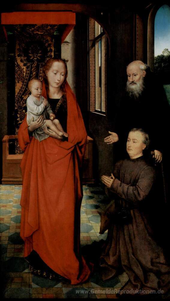 Wir bieten Ihnen eine handgefertigte Reproduktion auf Leinwand des berühmten Kunstwerks 'Jungfrau und Kind mit St. Antonius Abt und ein Donor' von Hans Memling, aus dem Reproduktionsmuseum.
