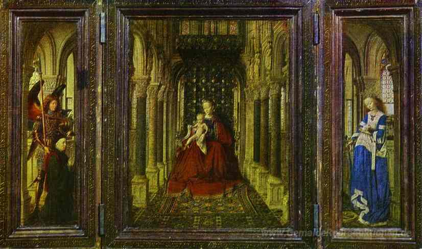 Wir bieten Ihnen eine handgefertigte Reproduktion auf Leinwand des berühmten Kunstwerks 'Jungfrau und Kind mit St. Michael, St. Katharina und einem Donor' von Jan van Eyck, aus dem Reproduktionsmuseum.