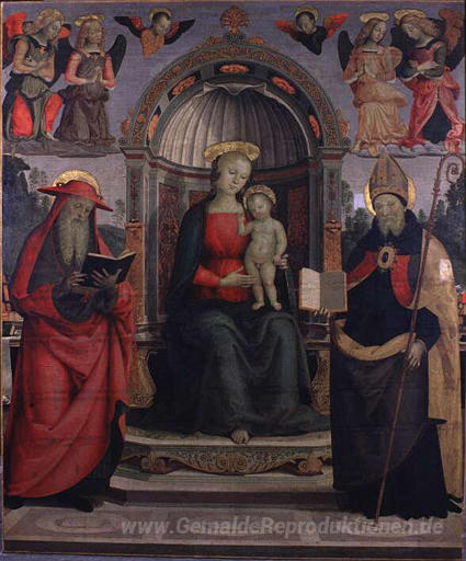 Wir bieten Ihnen eine handgefertigte Reproduktion auf Leinwand des berühmten Kunstwerks 'Jungfrau und St. Hieronymus und St. Augustine' von Pietro Perugino, aus dem Reproduktionsmuseum.