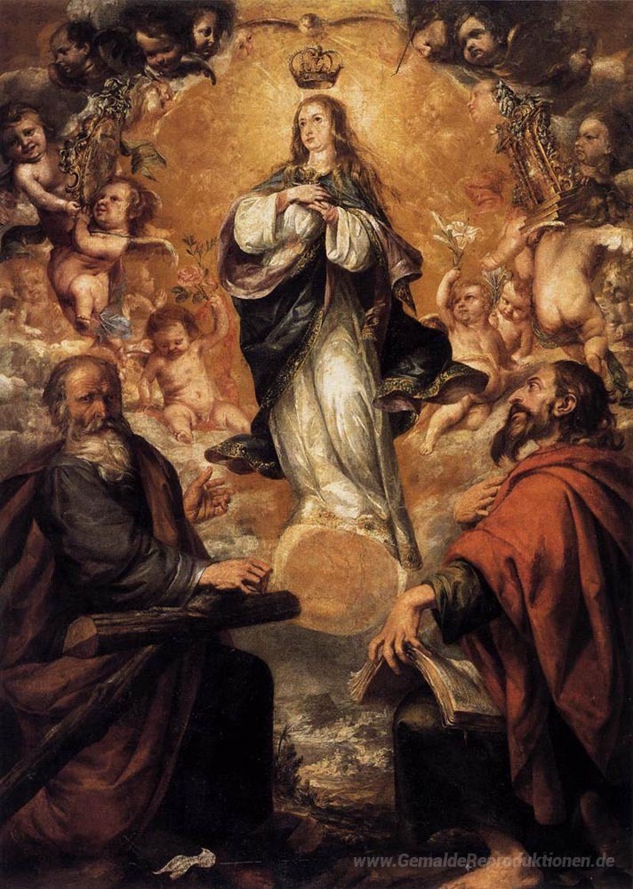 Wir bieten Ihnen eine handgefertigte Reproduktion auf Leinwand des berühmten Kunstwerks 'Jungfrau von der Unbefleckten Empfängnis mit Sts Andrew und Joha' von Juan de Valdes Leal, aus dem Reproduktionsmuseum.