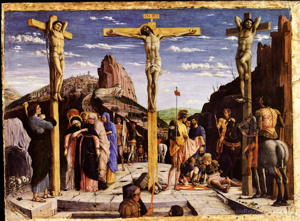 Wir bieten Ihnen eine handgefertigte Reproduktion auf Leinwand des berühmten Kunstwerks 'Kalvarienberg, Zentral Predellaplatte vom St. Zeno von Verona Al' von Andrea Mantegna, aus dem Reproduktionsmuseum.