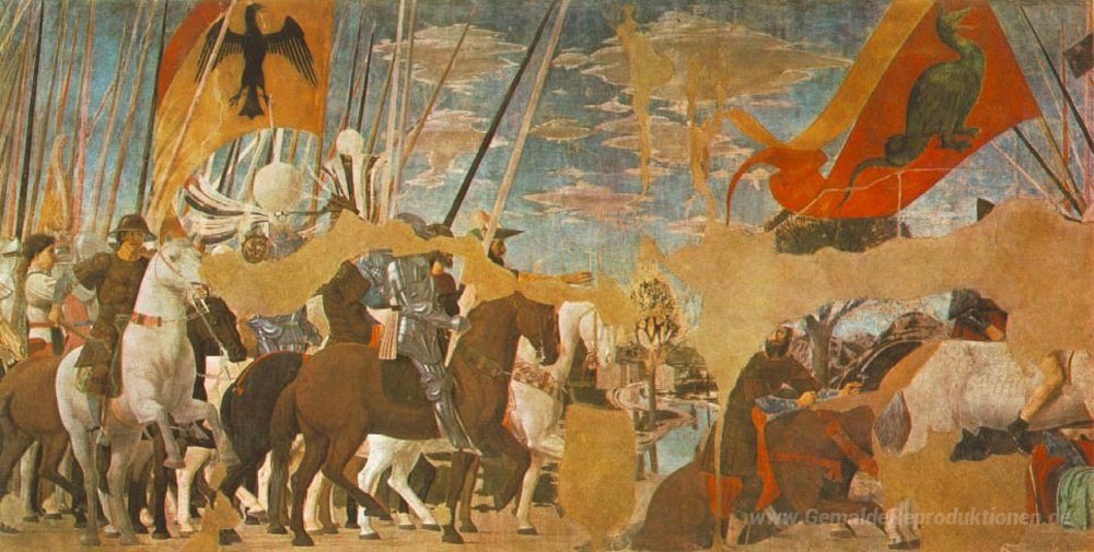 Wir bieten Ihnen eine handgefertigte Reproduktion auf Leinwand des berühmten Kunstwerks 'Kampf zwischen Konstantin und Maxentius' von Piero della Francesca, aus dem Reproduktionsmuseum.