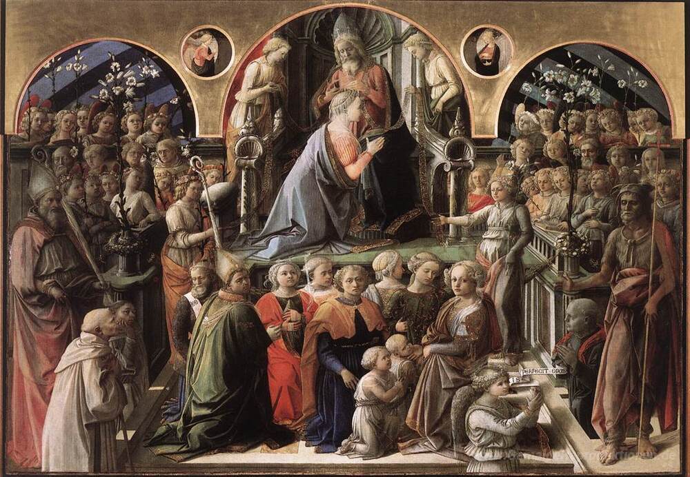 Wir bieten Ihnen eine handgefertigte Reproduktion auf Leinwand des berühmten Kunstwerks 'Krönung der Jungfrau' von Filippo Lippi, aus dem Reproduktionsmuseum.