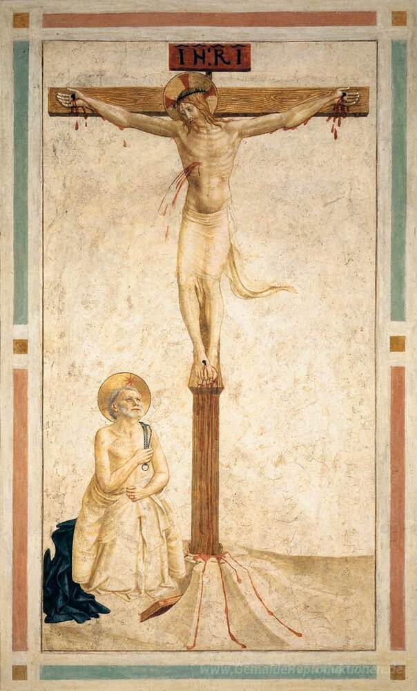 Wir bieten Ihnen eine handgefertigte Reproduktion auf Leinwand des berühmten Kunstwerks 'Kreuzigung mit St. Dominic flagellating selbst' von Fra Angelico, aus dem Reproduktionsmuseum.