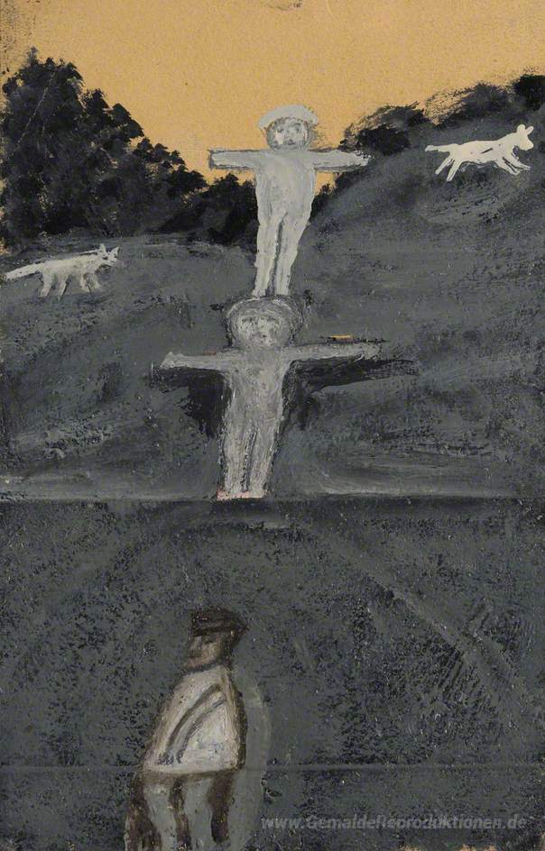 Wir bieten Ihnen eine handgefertigte Reproduktion auf Leinwand des berühmten Kunstwerks 'Kreuzigung oder Allegorie mit drei Figuren und zwei Hunde' von Alfred Wallis, aus dem Reproduktionsmuseum.
