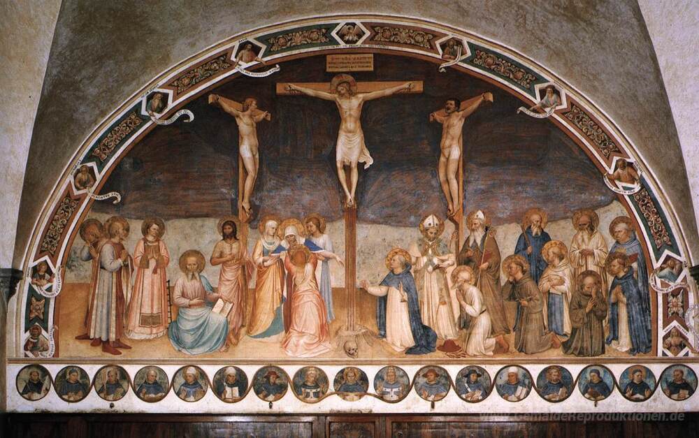 Wir bieten Ihnen eine handgefertigte Reproduktion auf Leinwand des berühmten Kunstwerks 'Kreuzigung und Heiligen' von Fra Angelico, aus dem Reproduktionsmuseum.
