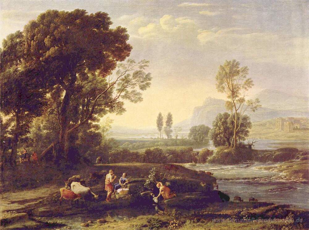 Wir bieten Ihnen eine handgefertigte Reproduktion auf Leinwand des berühmten Kunstwerks 'Landschaft mit der Flucht nach Ägypten' von Claude Lorrain, aus dem Reproduktionsmuseum.