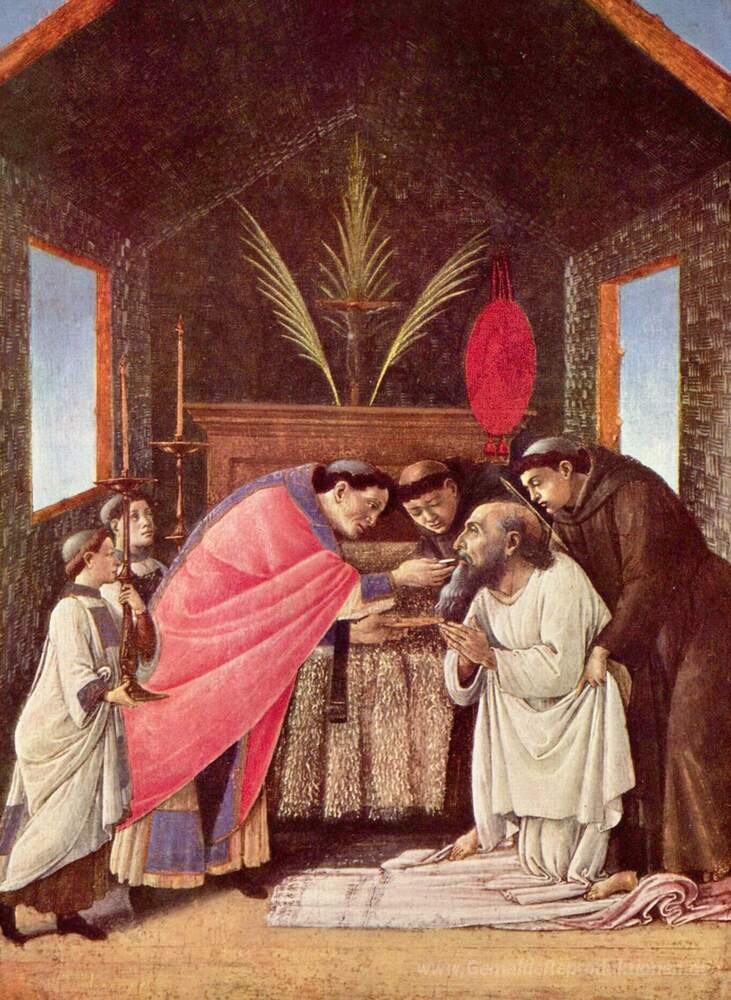 Wir bieten Ihnen eine handgefertigte Reproduktion auf Leinwand des berühmten Kunstwerks 'Letzte Kommunion von St Jerome' von Sandro Botticelli, aus dem Reproduktionsmuseum.