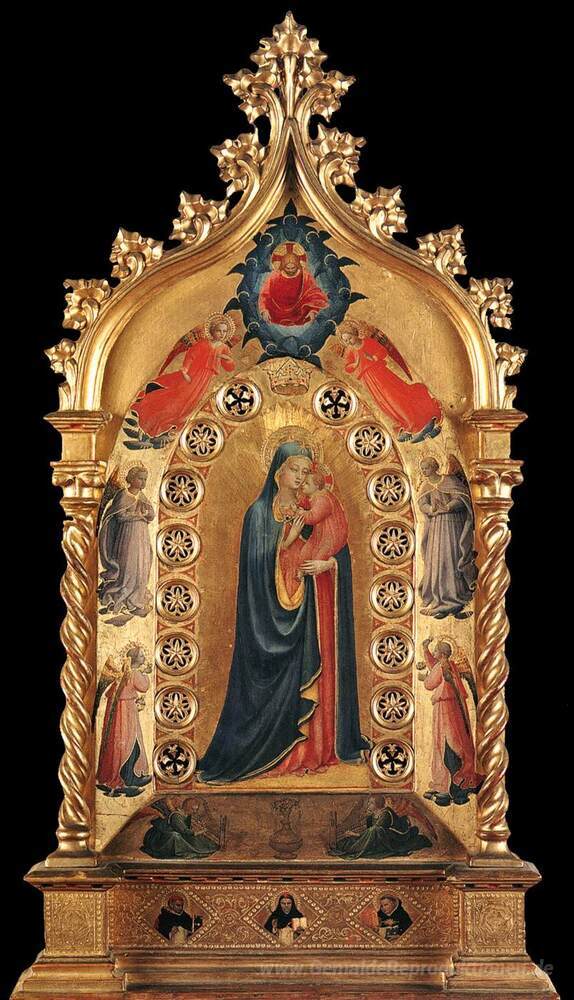 Wir bieten Ihnen eine handgefertigte Reproduktion auf Leinwand des berühmten Kunstwerks 'Madonna der Star' von Fra Angelico, aus dem Reproduktionsmuseum.