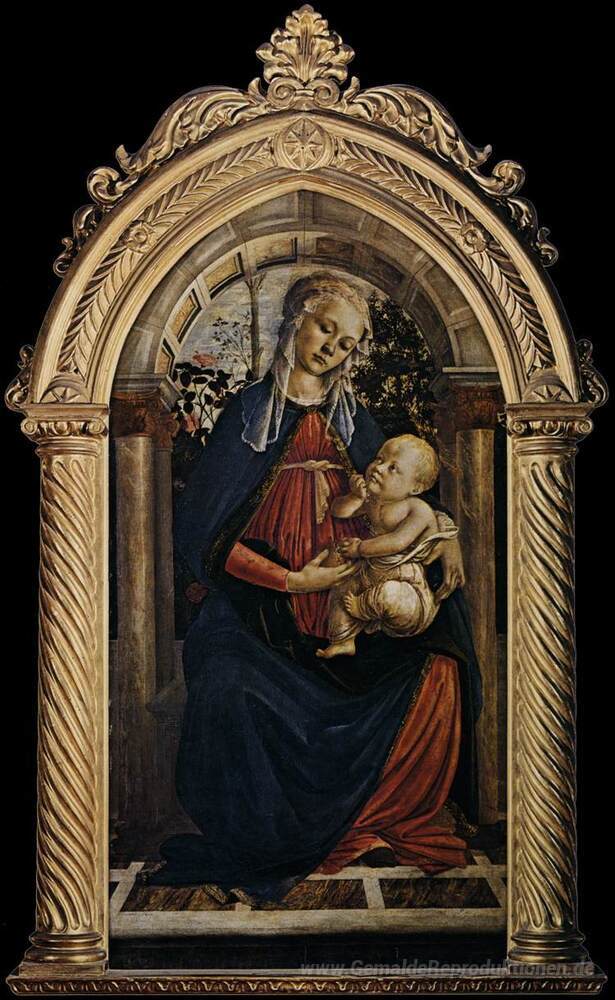 Wir bieten Ihnen eine handgefertigte Reproduktion auf Leinwand des berühmten Kunstwerks 'Madonna des Rosengarten' von Sandro Botticelli, aus dem Reproduktionsmuseum.