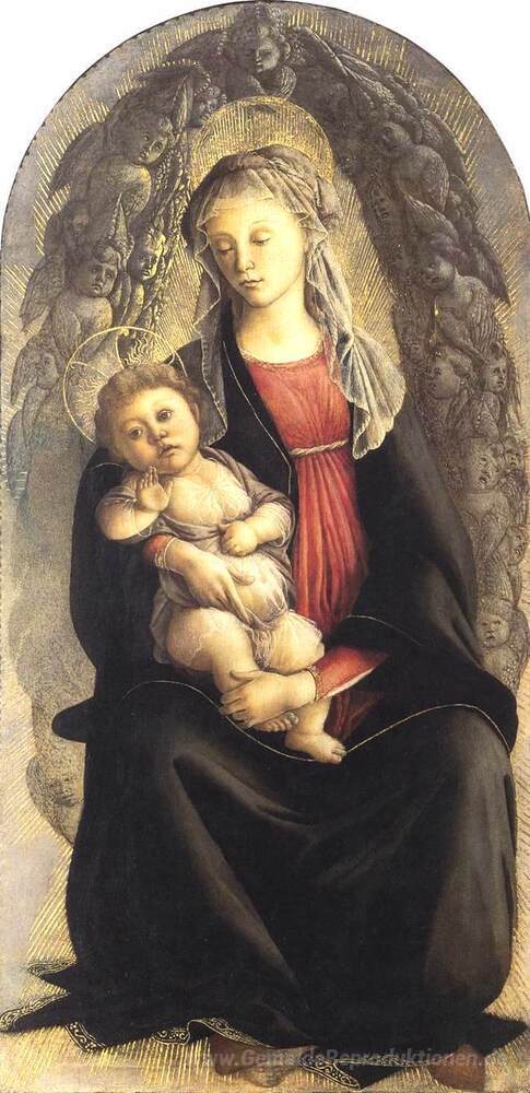 Wir bieten Ihnen eine handgefertigte Reproduktion auf Leinwand des berühmten Kunstwerks 'Madonna in der Glorie mit Seraphim' von Sandro Botticelli, aus dem Reproduktionsmuseum.
