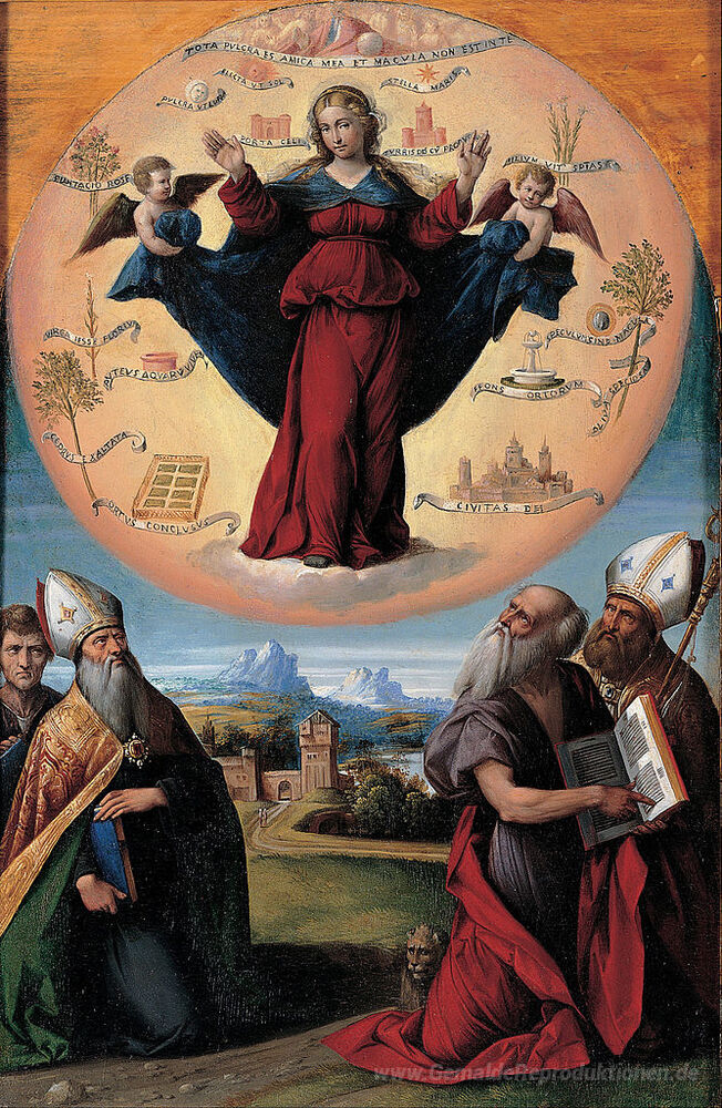 Wir bieten Ihnen eine handgefertigte Reproduktion auf Leinwand des berühmten Kunstwerks 'Madonna in der Glorie und Heiliger Hones' von Benvenuto Tisi, aus dem Reproduktionsmuseum.