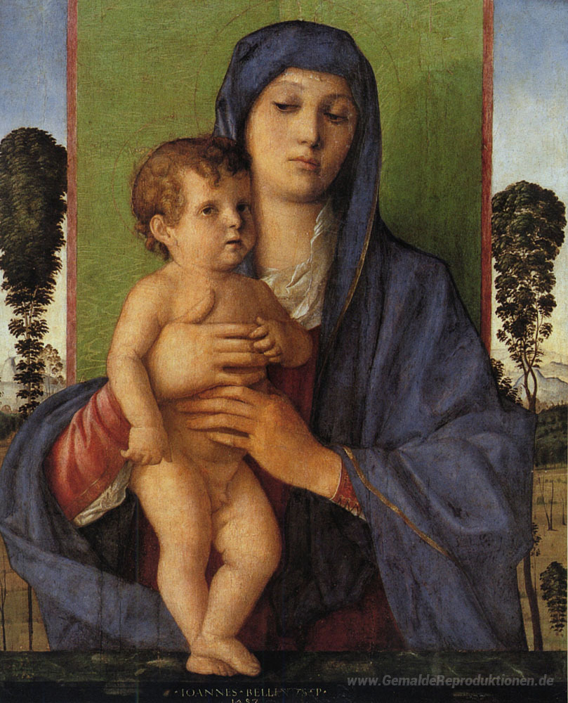Wir bieten Ihnen eine handgefertigte Reproduktion auf Leinwand des berühmten Kunstwerks 'Madonna mit Bäumen' von Giovanni Bellini, aus dem Reproduktionsmuseum.