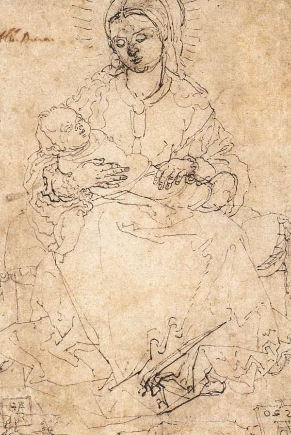 Wir bieten Ihnen eine handgefertigte Reproduktion auf Leinwand des berühmten Kunstwerks 'Madonna mit dem Kind auf einer Steinbank' von Albrecht Durer, aus dem Reproduktionsmuseum.
