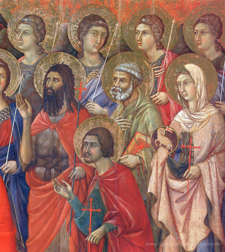 Wir bieten Ihnen eine handgefertigte Reproduktion auf Leinwand des berühmten Kunstwerks 'Madonna mit Kind auf dem Thron (Vorderseite-Fragment)' von Duccio, aus dem Reproduktionsmuseum.