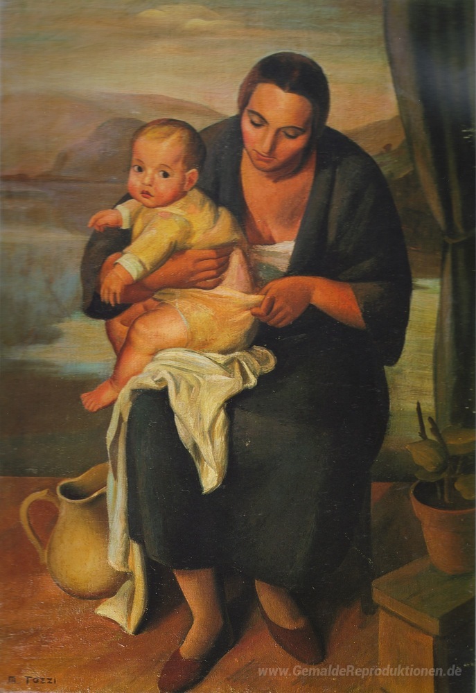 Wir bieten Ihnen eine handgefertigte Reproduktion auf Leinwand des berühmten Kunstwerks 'Madonna mit Kind' von Mario Tozzi, aus dem Reproduktionsmuseum.