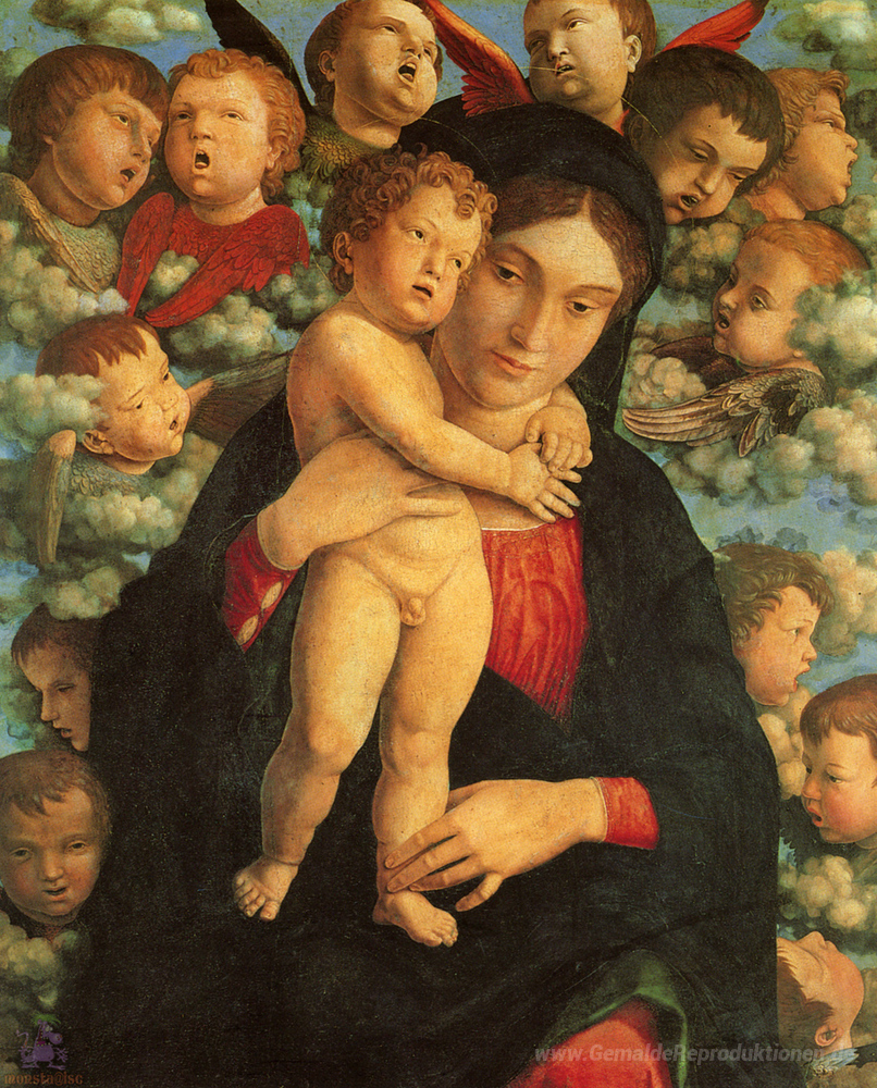 Wir bieten Ihnen eine handgefertigte Reproduktion auf Leinwand des berühmten Kunstwerks 'Madonna mit Kind und Engel' von Andrea Mantegna, aus dem Reproduktionsmuseum.