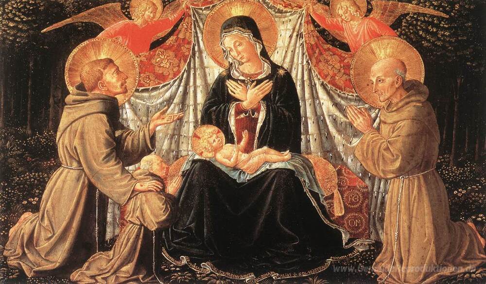 Wir bieten Ihnen eine handgefertigte Reproduktion auf Leinwand des berühmten Kunstwerks 'Madonna mit Kind und Heiligen Franziskus und der Spender Fra Jac' von Benozzo Gozzoli, aus dem Reproduktionsmuseum.