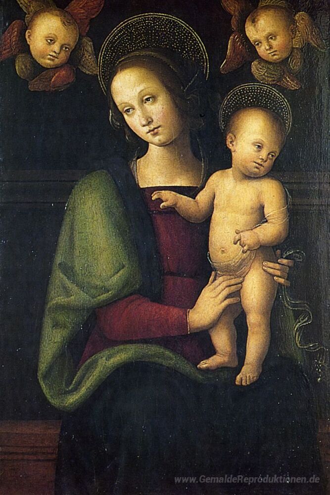 Wir bieten Ihnen eine handgefertigte Reproduktion auf Leinwand des berühmten Kunstwerks 'Madonna mit Kind und zwei Engeln' von Pietro Perugino, aus dem Reproduktionsmuseum.