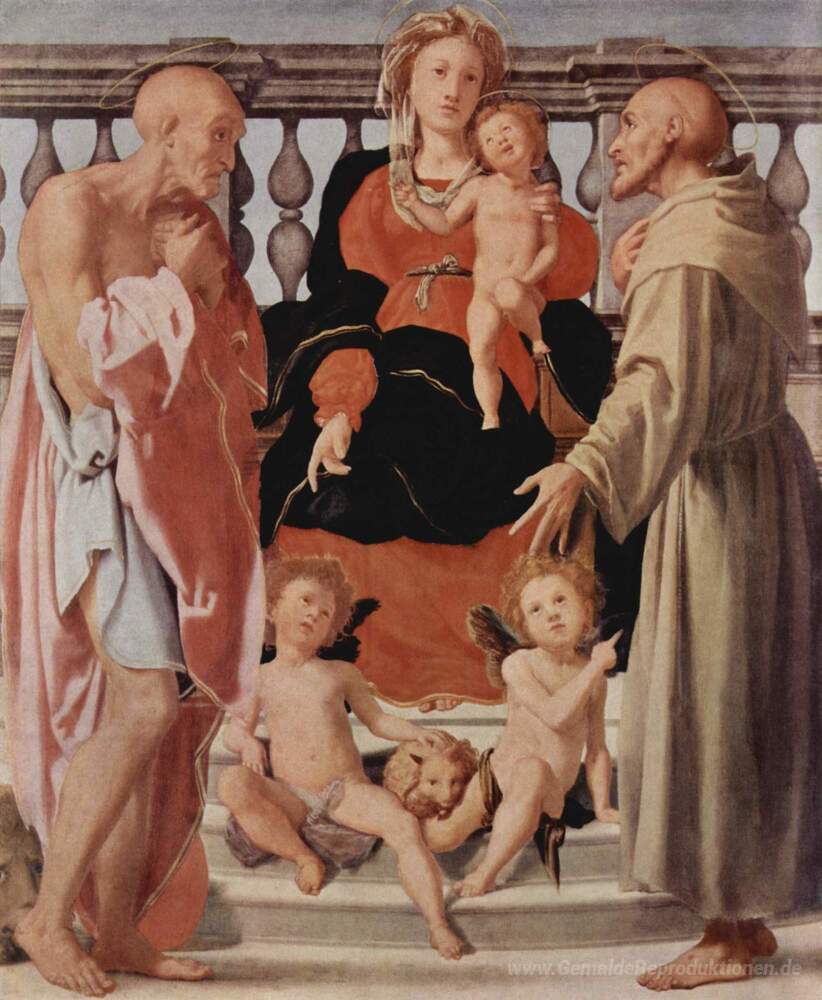 Wir bieten Ihnen eine handgefertigte Reproduktion auf Leinwand des berühmten Kunstwerks 'Madonna mit St. Franziskus und St. Jerome' von Jacopo Pontormo, aus dem Reproduktionsmuseum.