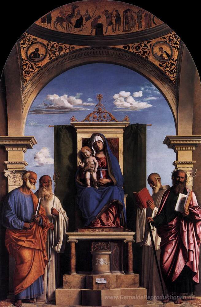 Wir bieten Ihnen eine handgefertigte Reproduktion auf Leinwand des berühmten Kunstwerks 'Madonna und Kind inthronisiert mit Heiligen' von Cima da Conegliano, aus dem Reproduktionsmuseum.