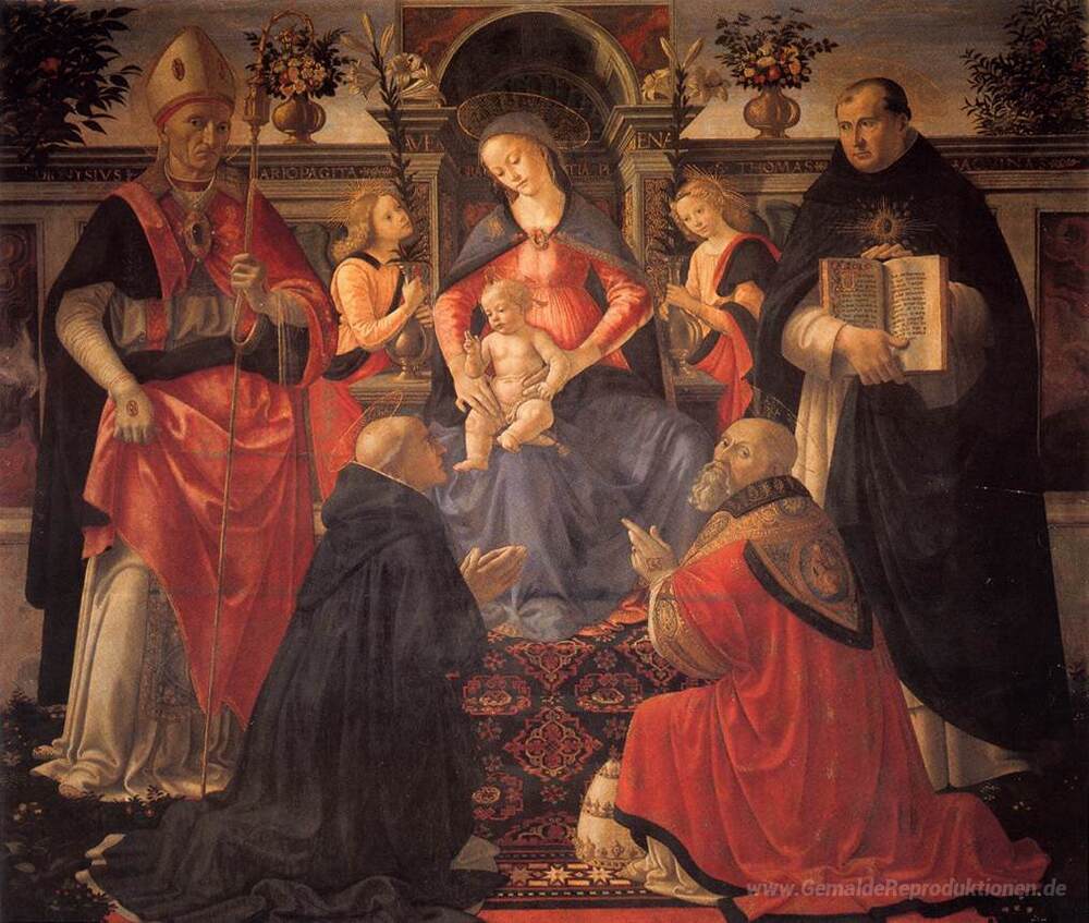 Wir bieten Ihnen eine handgefertigte Reproduktion auf Leinwand des berühmten Kunstwerks 'Madonna und Kind inthronisiert mit St. Dionysius, Aeropagita, Do' von Domenico Ghirlandaio, aus dem Reproduktionsmuseum.