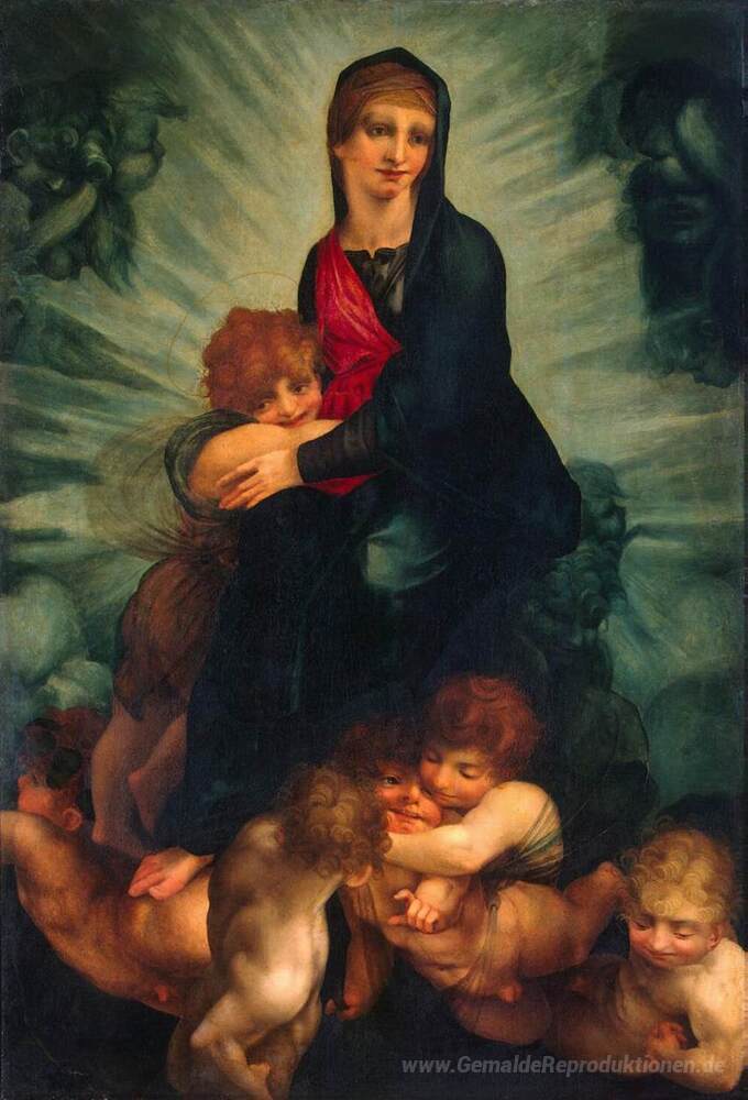 Wir bieten Ihnen eine handgefertigte Reproduktion auf Leinwand des berühmten Kunstwerks 'Madonna und Kind mit Putti' von Rosso Fiorentino, aus dem Reproduktionsmuseum.