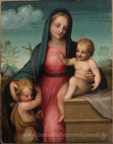 Wir bieten Ihnen eine handgefertigte Reproduktion auf Leinwand des berühmten Kunstwerks 'Madonna und Kind mit St. Johannes der Täufer' von Andrea del Sarto, aus dem Reproduktionsmuseum.