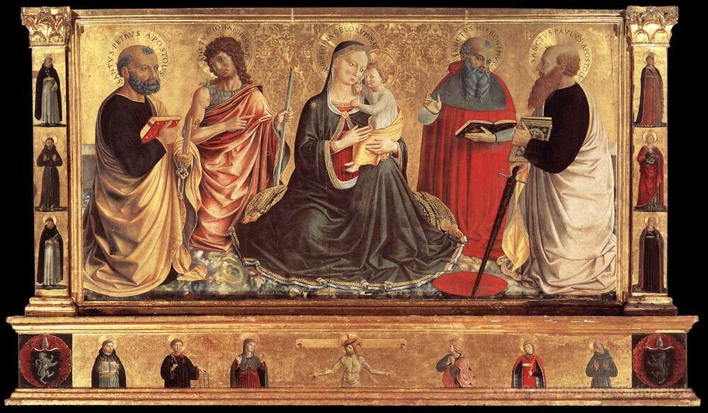 Wir bieten Ihnen eine handgefertigte Reproduktion auf Leinwand des berühmten Kunstwerks 'Madonna und Kind mit St. Johannes der Täufer, Petrus, Jerome und' von Benozzo Gozzoli, aus dem Reproduktionsmuseum.