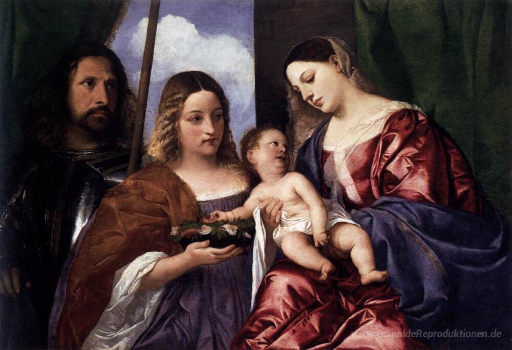 Wir bieten Ihnen eine handgefertigte Reproduktion auf Leinwand des berühmten Kunstwerks 'Madonna und Kind mit Sts Dorothy und George' von Titian, aus dem Reproduktionsmuseum.