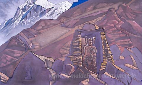 Wir bieten Ihnen eine handgefertigte Reproduktion auf Leinwand des berühmten Kunstwerks 'Maitreya unterwegs' von Nicholas Roerich, aus dem Reproduktionsmuseum.