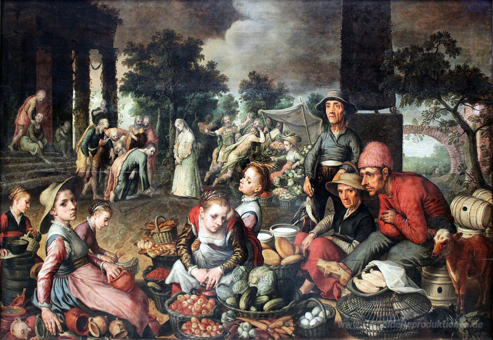 Wir bieten Ihnen eine handgefertigte Reproduktion auf Leinwand des berühmten Kunstwerks 'Markt mit Christus und die Ehebrecherin' von Pieter Aertsen, aus dem Reproduktionsmuseum.
