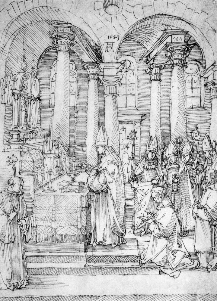 Wir bieten Ihnen eine handgefertigte Reproduktion auf Leinwand des berühmten Kunstwerks 'Messe von Kardinal Albrecht von Brandenburg in der Abteikirche H' von Albrecht Durer, aus dem Reproduktionsmuseum.