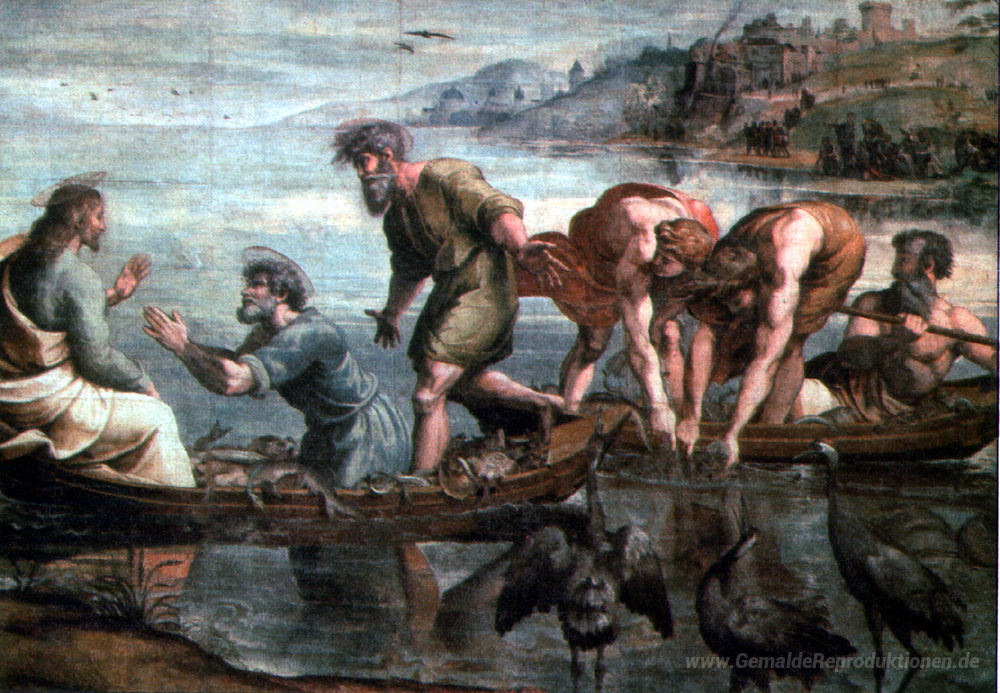 Wir bieten Ihnen eine handgefertigte Reproduktion auf Leinwand des berühmten Kunstwerks 'Miraculous Fischzug' von Raphael, aus dem Reproduktionsmuseum.