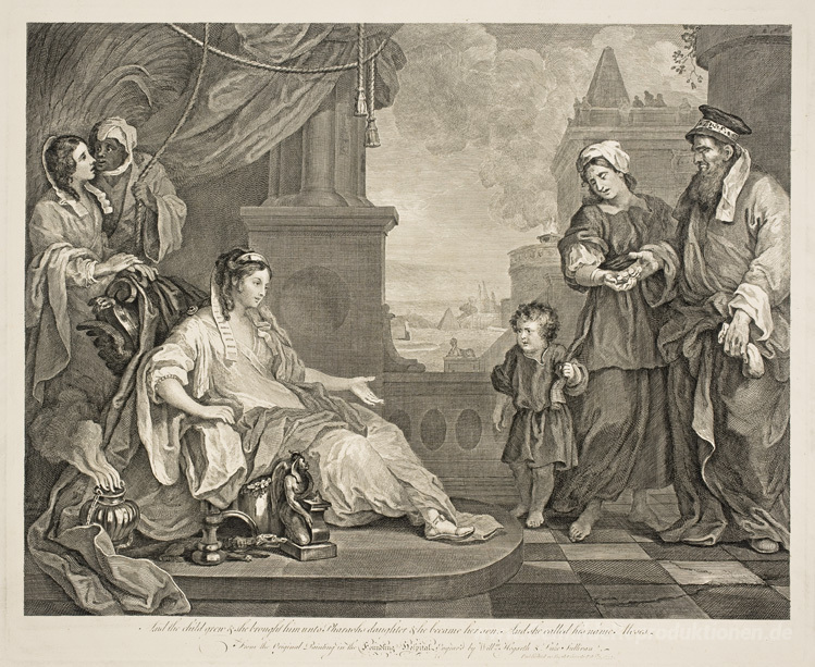 Wir bieten Ihnen eine handgefertigte Reproduktion auf Leinwand des berühmten Kunstwerks 'Moses gebracht, um die Tochter des Pharao' von William Hogarth, aus dem Reproduktionsmuseum.