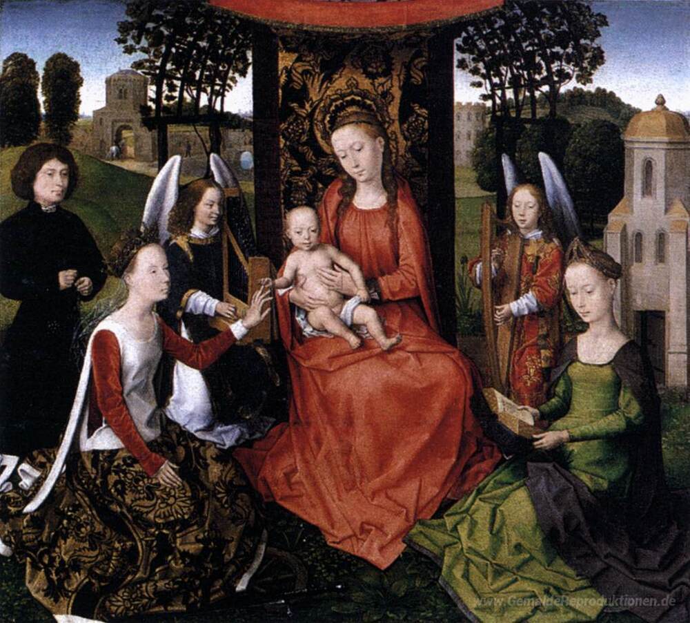 Wir bieten Ihnen eine handgefertigte Reproduktion auf Leinwand des berühmten Kunstwerks 'Mystische Vermählung der heiligen Katharina' von Hans Memling, aus dem Reproduktionsmuseum.
