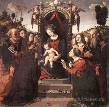 Wir bieten Ihnen eine handgefertigte Reproduktion auf Leinwand des berühmten Kunstwerks 'Mystische Vermählung der heiligen Katharina von Alexandria' von Piero di Cosimo, aus dem Reproduktionsmuseum.