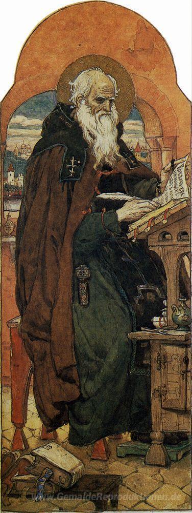 Wir bieten Ihnen eine handgefertigte Reproduktion auf Leinwand des berühmten Kunstwerks 'Nestor der Chronist' von Viktor Vasnetsov, aus dem Reproduktionsmuseum.